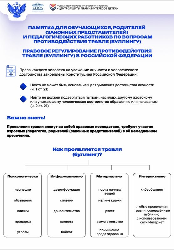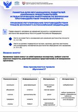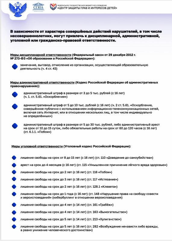 В памятке обозначены виды противоправного поведения, которые отражают проявления травли и меры дисциплинарной, административной, уголовной или гражданско-правовой ответственности, к которым могут привлечь нарушителей, в том числе несовершеннолетних.